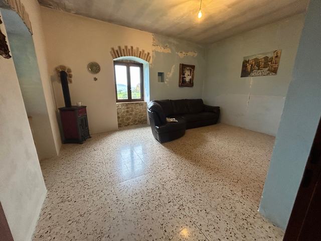 Villa di campagna in muratura su tre piani, parzialmente ristrutturata e rimodernata, con vista panoramica sulla campagna circostante.